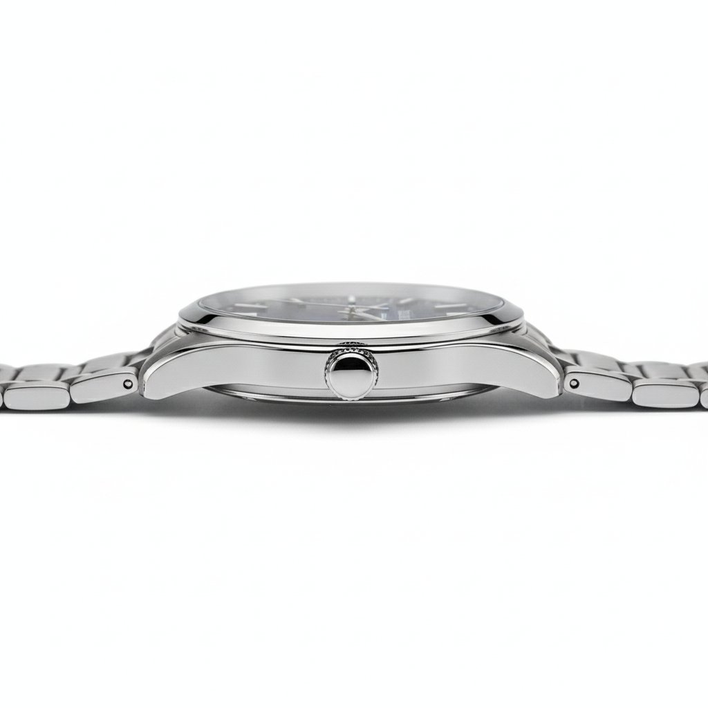 Features a 40mm case diameter, a slim 8.5mm profile, and 5 ATM water resistance. Powered by a highly accurate Japanese Miyota quartz movement for unwavering reliability.